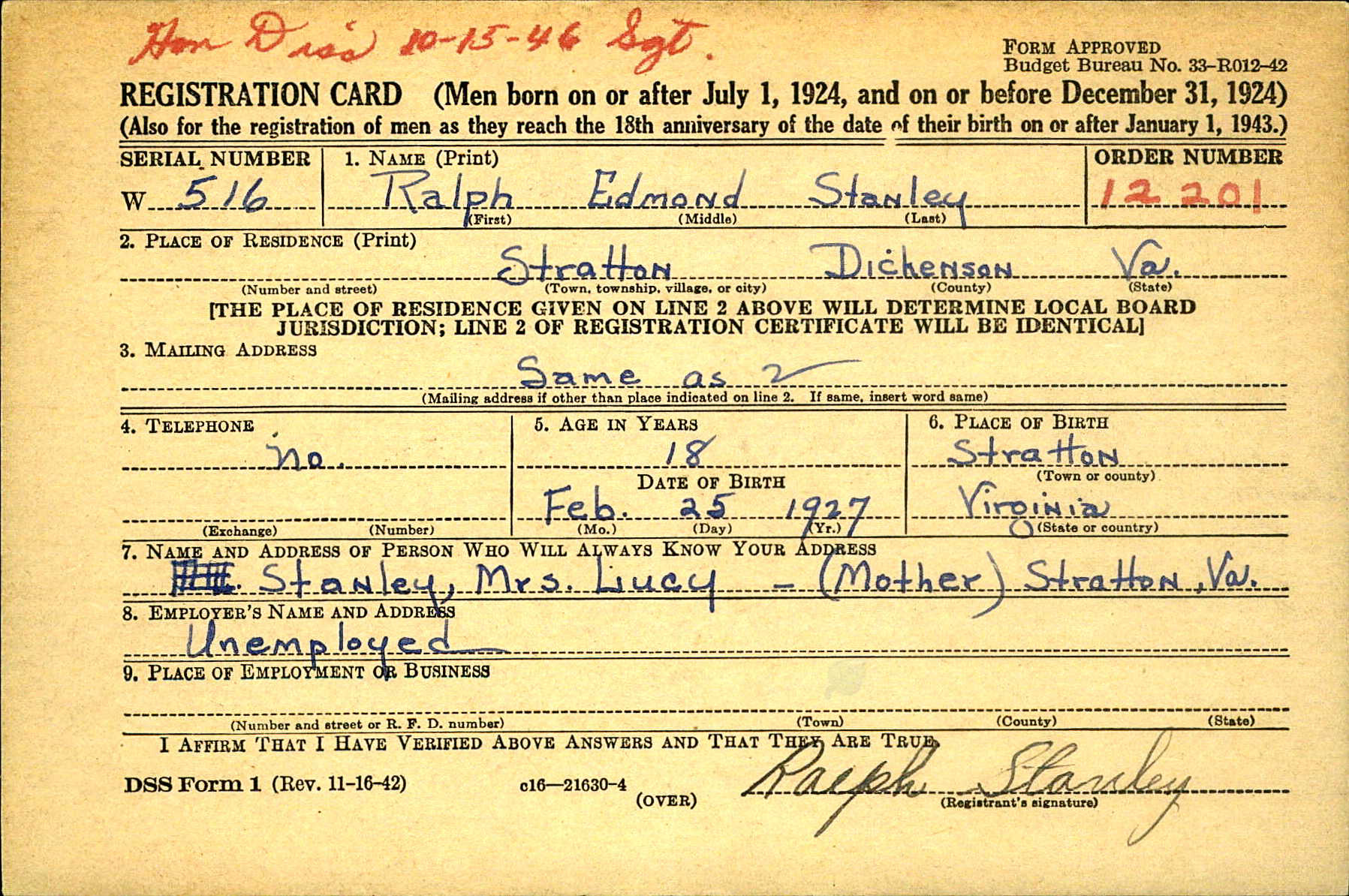 Photo: Ralph Stanley's army enlistment/discharge paper.