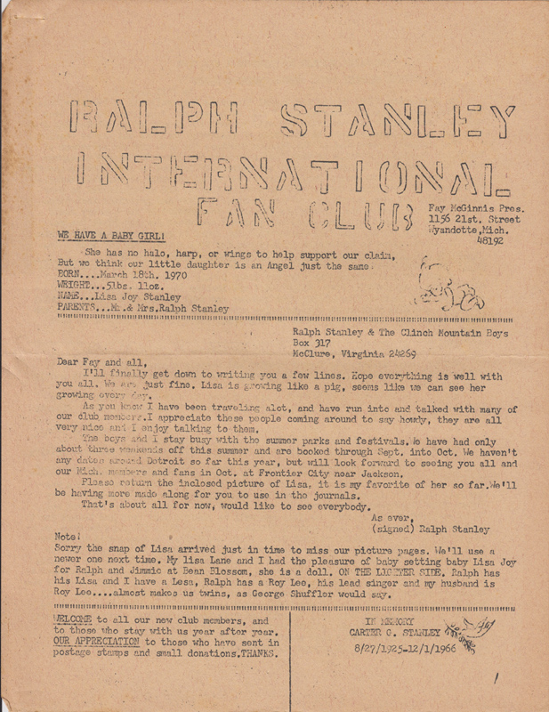 Images from a Sep. 1970 Ralph Stanley Fan Club newsletter.