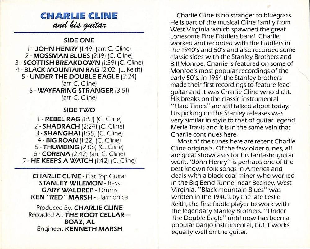 Although known mostly for his fiddle work, Charlie Cline could play anything with strings. He picked banjo on some of the Lonesome Pine Fiddlers cuts in the '50s and on the 1951 session for King with Jimmy Martin / Bobby Osborne & Curly Ray Cline. His lead guitar work can be heard Used To Be and Brown County Breakdown from Bill Monroe's 15 Sep 1955 recordings. Most notably, however, it's Charlie's guitar work on The Stanley Brothers Hard Times which attracts greatest interest. One of five tracks they recorded in Nashville on 29 Aug 1954, the others being Harbor Of Love, Blue Moon Of Kentucky, Calling From Heaven and Close By. They all feature Charlie to some extent providing lead guitar fills, and this was the first time the Stanley Brothers used lead guitar, something which would become an important part of the 'Stanley sound' in the subsequent decades.