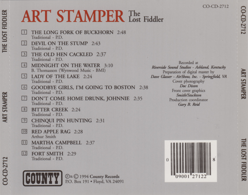Backing on the 'Lost Fiddler' album includes Danny Jones (who was then playing with Art in The Goins Brothers), Art's son Blake Stamper, and JD Crowe on 6 tracks. Harry Bickel, a Kentucky State Old-Time Banjo Champion & dentist from Louisville, also plays clawhammer on the remaining 6 tracks and provides the liner notes.