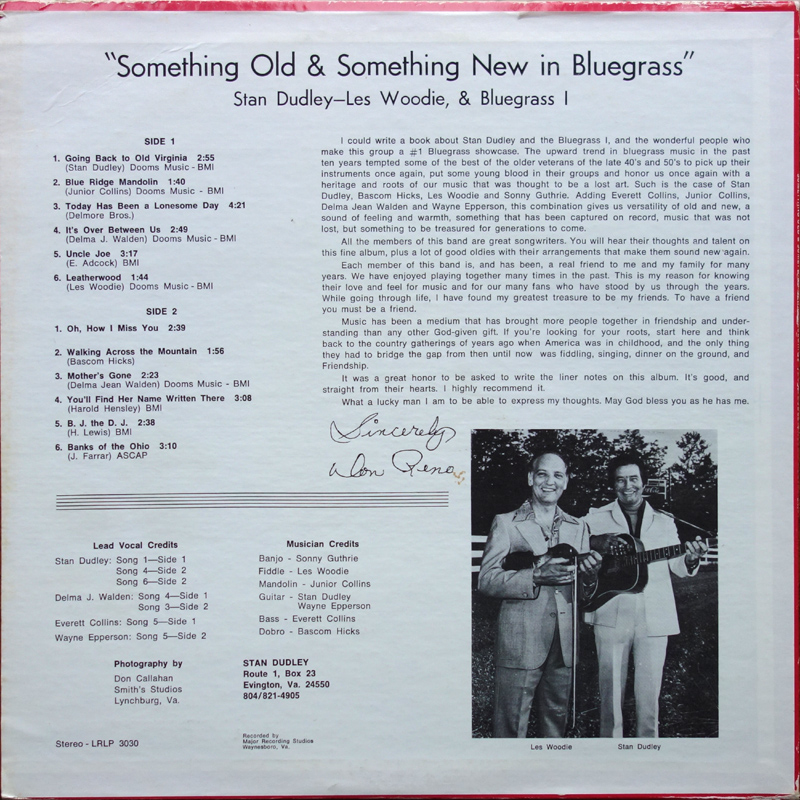 The LP features liner notes by Don Reno and the cover photo was taken at Shady Valley Bluegrass Park in Evington, Virginia. The park was the site of Don Reno's "1st Annual Summer Bluegrass Festival & Fiddlers Convention" on 23 Jul 1978, which also featured Ralph Stanley and Stan Dudley & Bluegrass 1.
