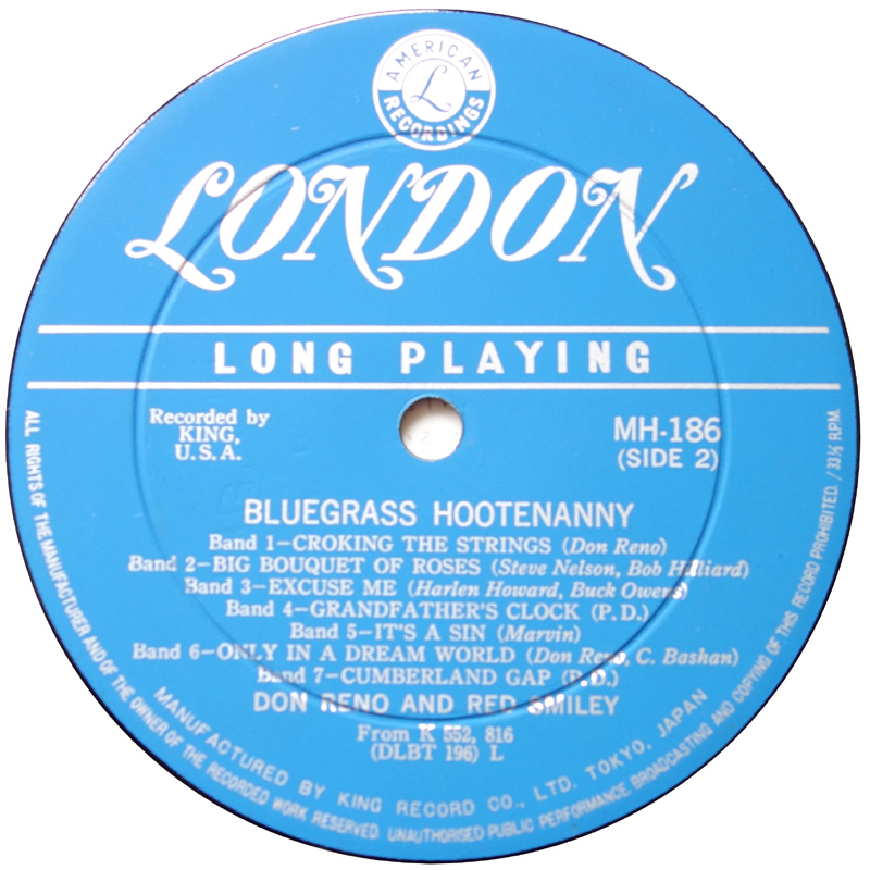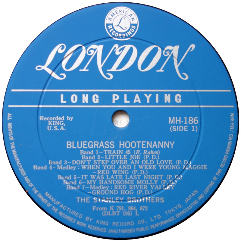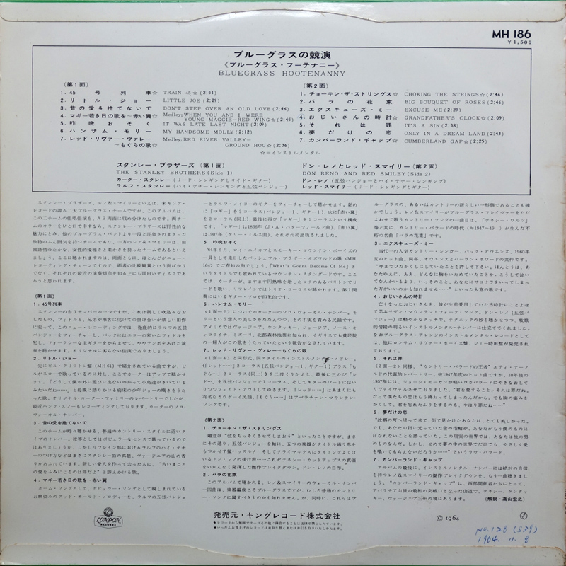 This Japanese compilation contains seven tracks each by The Stanley Brothers and Don Reno & Red Smiley. It came with an LP sized insert with English lyrics.