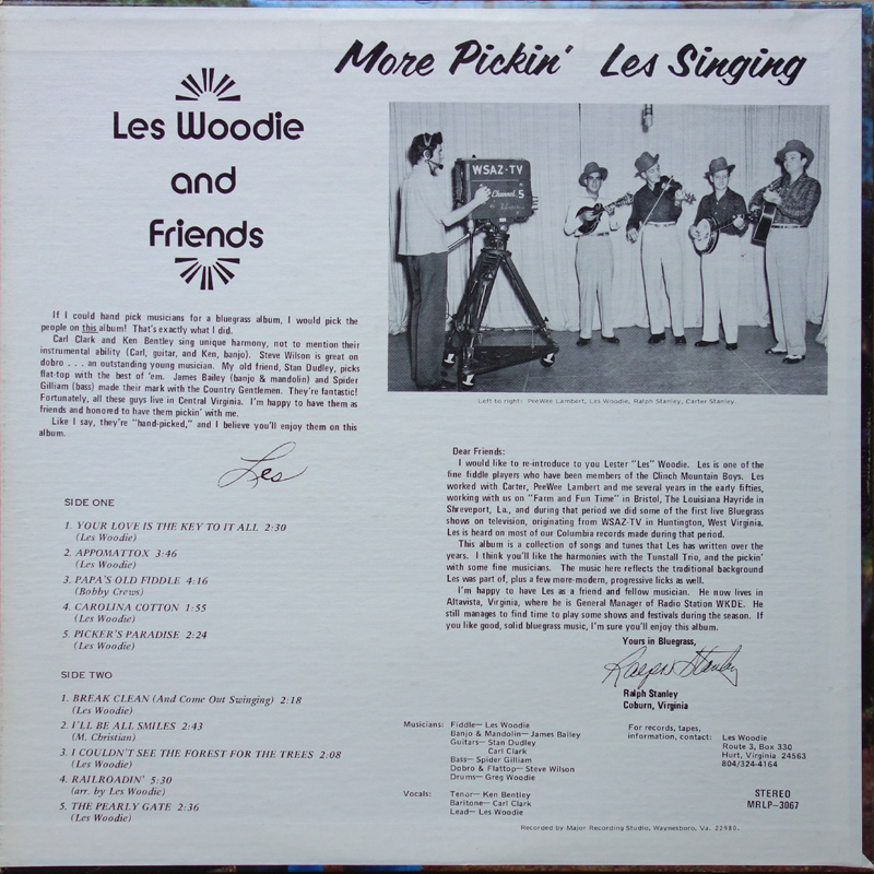 The 'Friends' on the record consist of:- Stan Dudley, who recorded with Lester on the LPs Something Old & Something New In Bluegrass, and 'The Last Letter: Featuring Juanita'; Carl Clark & Ken Bentley from Tunstall Trio, who Lester was working with since 1976; Steve Wilson who'd played with Lester on the Roby Huffman & the Bluegrass Cutups 'Colorado River' LP and later played on The Tunstall Trio's 'Up stepped Jesus' LP; and James Bailey & Spider Gilliam from the then current line-up of the Country Gentlemen. Lester son, Greg Woodie is also credited on drums, though he's either very low in the mix, or isn't featured on most of the tracks.