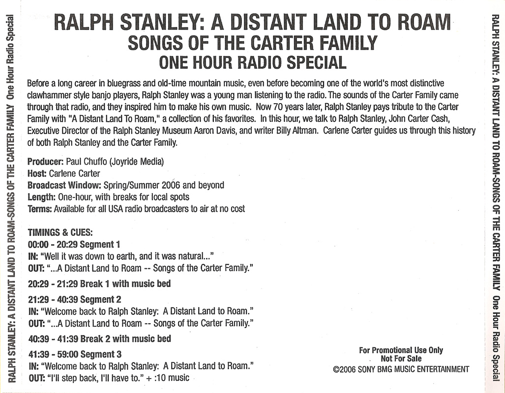 This curio is a promotional CD-R made available for radio stations, featuring music from the A Distant Land To Roam album. It also includes interview snippets by Ralph Stanley, John Carter Cash, Aaron Davis (Executive Director of the Ralph Stanley Museum) and writer Billy Altman, and is narrated by Carlene Carter.