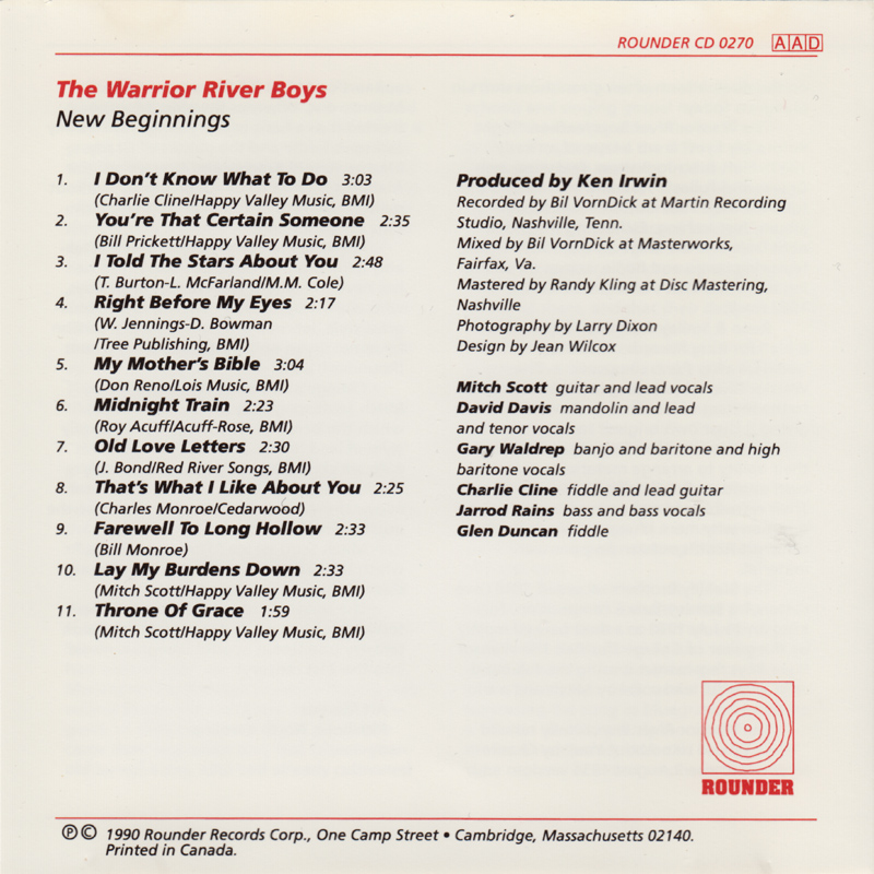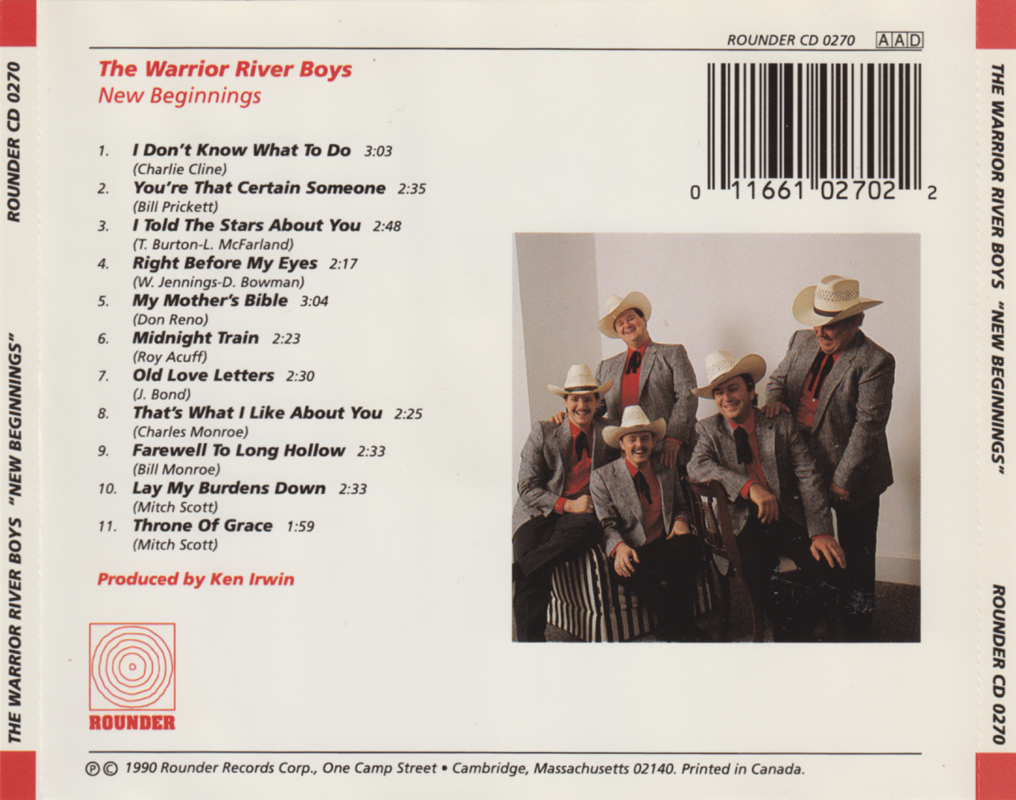 The Warrior River Boys hit a new musical high point on their first CD for Rounder. Featuring top-drawer trad-bluegrass, it draws inspiration from Bill Monroe & his contemporaries, but with a finesse & 'authenticity' rarely matched in recent times.