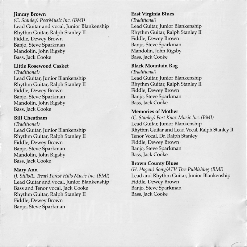 Junior sings lead on Jimmy Brown, Mary Ann and More Pretty Girls Than One; Ralph II sings a superb lead on Memories Of Mother; and John Rigsby, I think, takes the honours on Worried Man Blues.