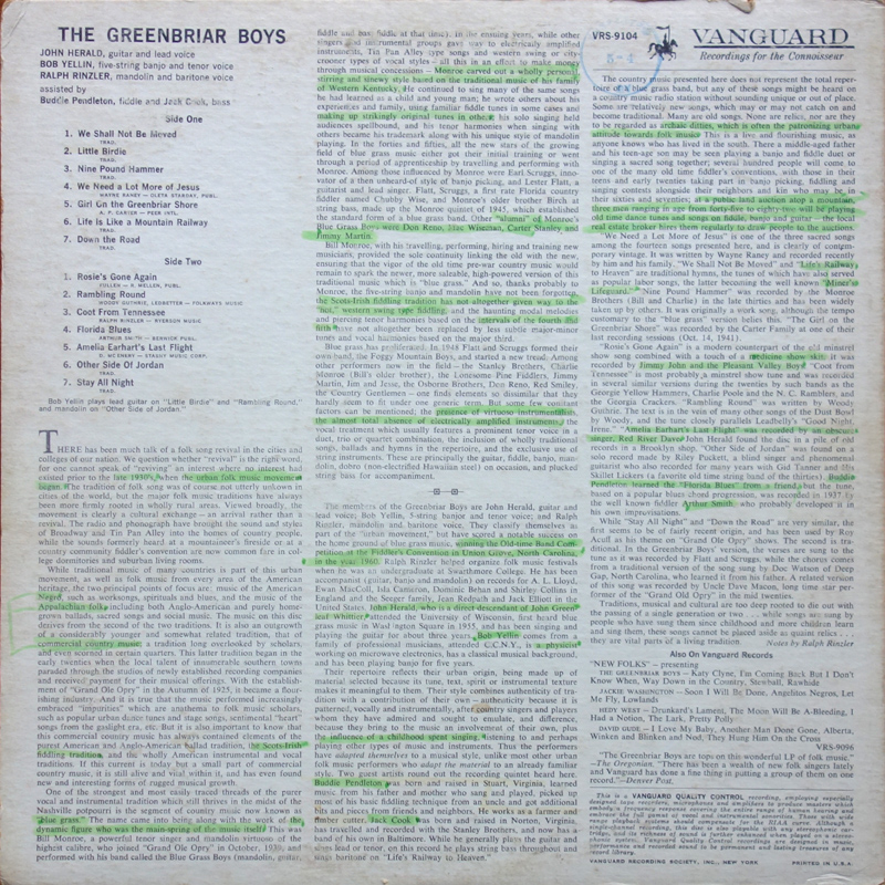 Three of the songs are quite amusing:- the rendition of Wayne Raney's We Need A Lot More Jesus (And A Lot Less Rock 'n' Roll), seems to be somewhat tongue-in-cheek; the novelty song Rosie's Gone Again which is quite faithful to the original by Jimmie Fuller and recorded by him as 'Jimmie John with Knox County Ramblers and Hillbilly Millie' / Jimmie John with The Pleasant Valley Boys' in 1957; and Coot From Tennessee which although credited to Ralph Rinzler on the LP has its roots in a song called I'm Goin' To Live Anyhow Till I Die, published in 1891 and credited to Shepard N. Edmonds. As Rinzler's liner notes acknowledge, the song "...is most probably a minstrel show tune and was recorded in several similar versions during the twenties by such bands as the Georgia Yellow Hammers, Charlie Poole and the N.C. Ramblers, and the Georgia Crackers". Lyrically the Greenbriar's version seems close to Charlie Poole's Coon From Tennessee with a slight change to the title to make it palatable.[2]