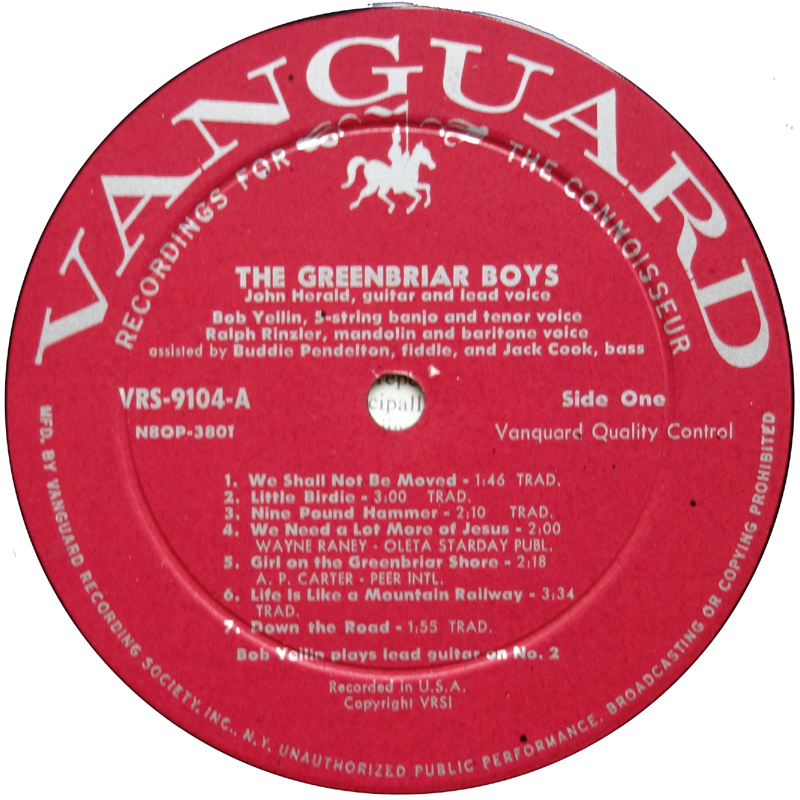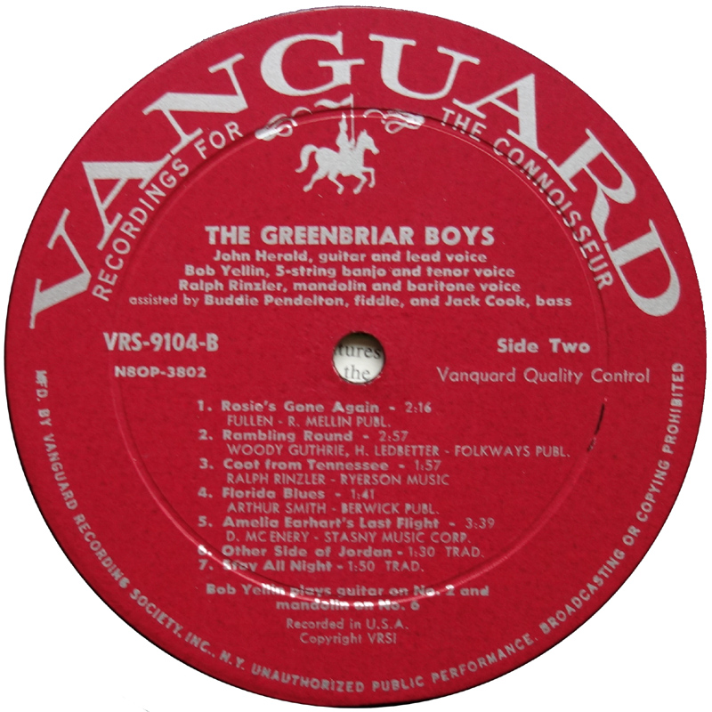 Two of the songs appear to be the first bluegrass versions to be recorded. Amelia Earhart's Last Flight is I believe the first bluegrass rendition of the tune. It was first recorded by it's composer 'Red River Dave' (Dave McEnery) in 1941, and the Greenbriar Boys' version pre-dates the Country Gents recording by 6 years (as Amelia Earhart). According to the liner notes, John Herald found the song in a pile of old records in a Brooklyn record shop.