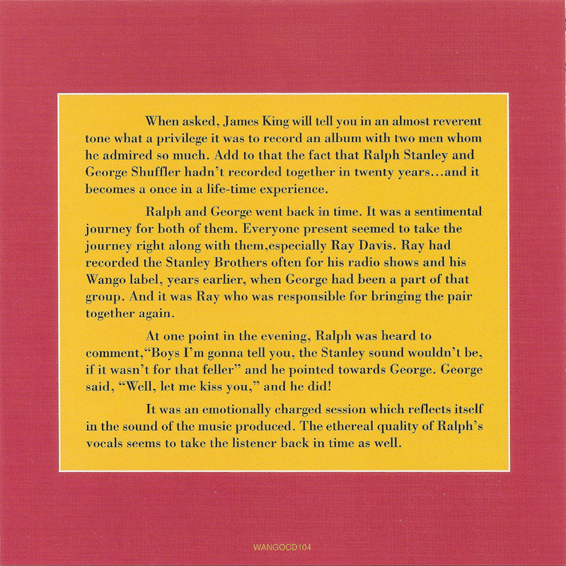 Presumably Ray Davis had them perform in his Baltimore Basement Studio, although the cover shows Ralph, James and George on stage, the recording is definitely one done in a studio, and there is a photo from Freight Trains Ride Again, Vol. 2 which shows James King, Curly Ray Cline and George Shuffler in Ray Davis' basement studio.