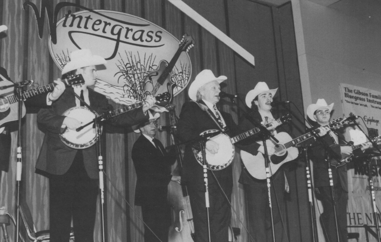 Photo: Wintergrass, Tacoma, Wa. 24th Feb 1996. L-R: James Alan Shelton (hidden), Steve Sparkman, Jack Cooke, Ralph Stanley, Ralph II, John Rigsby. Photo (probably) by Miles Ward.