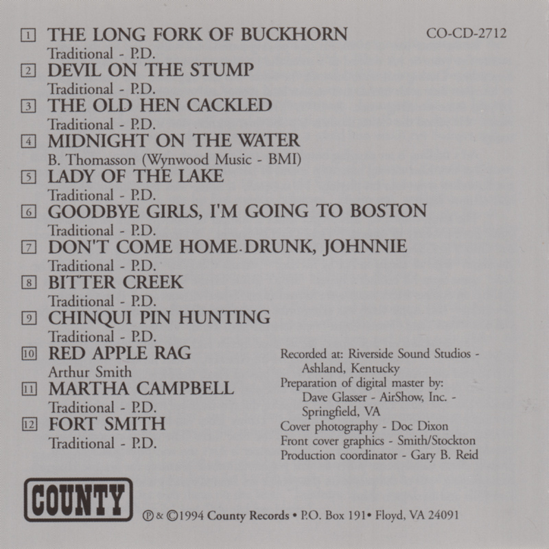 NB: (a) clawhammer banjo on The Long Fork Of The Buckhorn, The Old Hen Cackled, Goodbye Girls, I'm Going To Boston, Don't Come Home Drunk, Johnnie, Chinqui Pin Hunting and Martha Campbell.