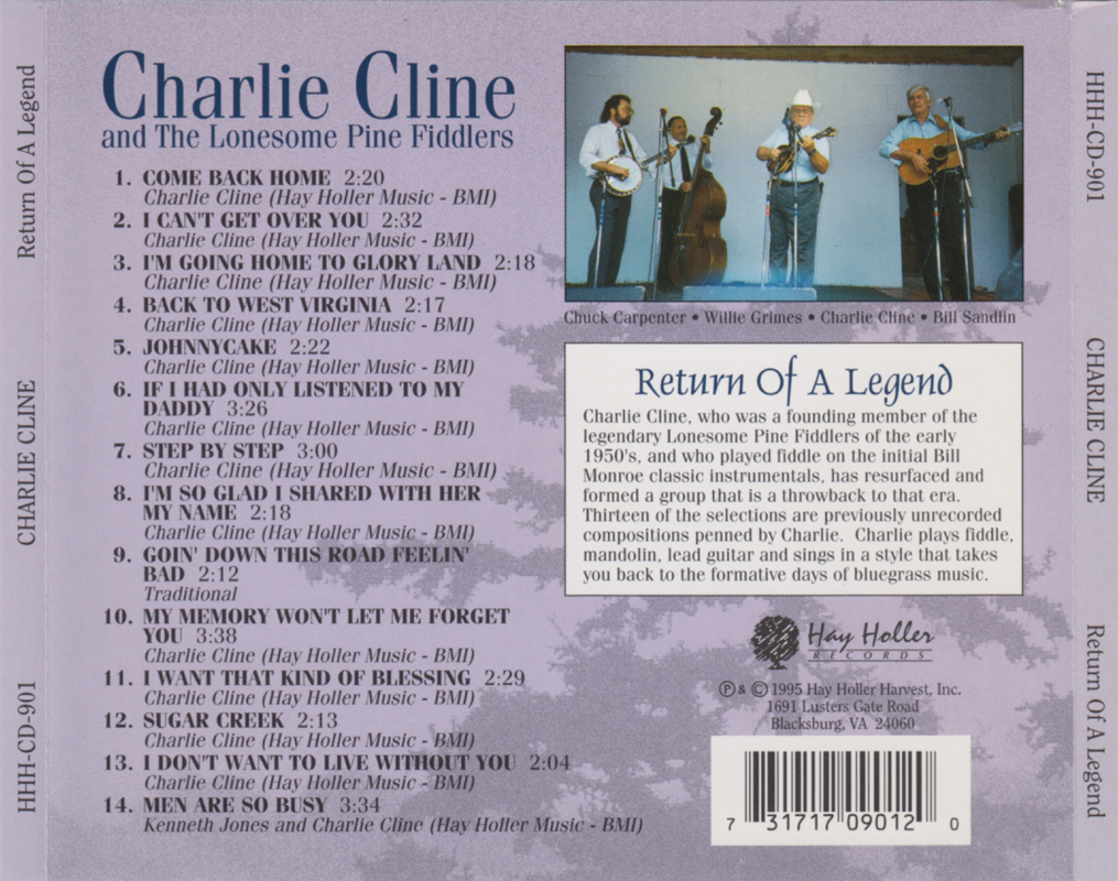 In terms of the "Legend" reference in the album title, it's worth remembering that Charlie spent about 5 years working for Bill Monroe (of and on) in the 1950s, playing on ten or so of Bill's Decca sessions on fiddle or lead guitar. He even played mandolin on some shows when Bill had broken his collar bone.[1]