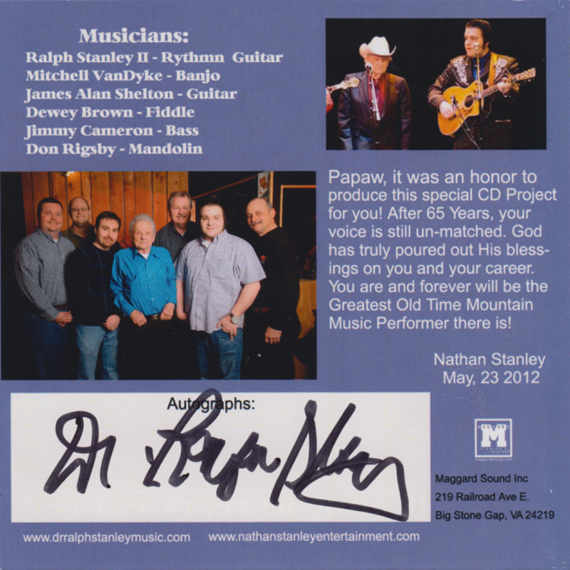 This CD-R contains 12 recordings made by Ralph at Maggard Sound Studio, probably around 2011-2012 judging by the musicians and Nathan Stanley's liner notes. It was sold at shows around 2012, and is labelled as "Produced by Nathan Stanley for Nathan Stanley Entertainment and in association with Stanley Tone Records".