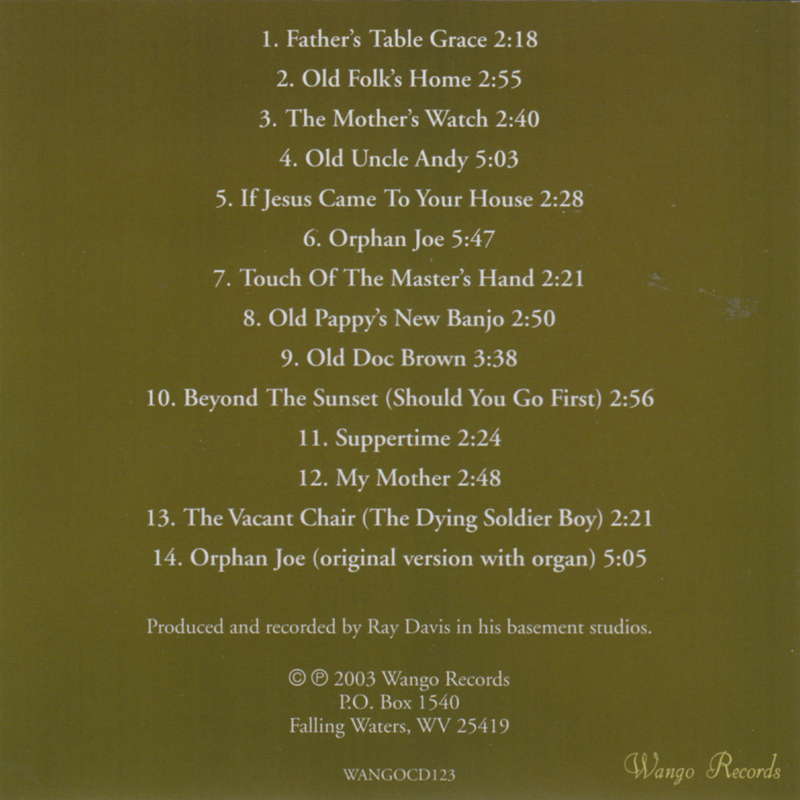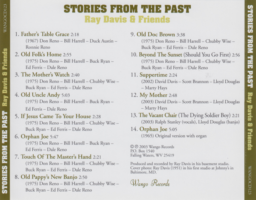 The other material consists of recitations by Ray Davis, with backing from various 1975 sessions by Don Reno & Bill Harrell, assisted by Duck Austin, Ed Ferris, Dale Reno, Ronnie Reno, Buck Ryan, Chubby Wise. Two tracks are from 2002 & 2003 and feature David Davis, Scott Brannon, Lloyd Douglas and Marty Hays.