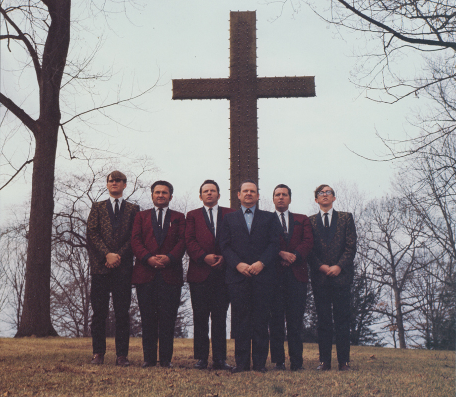 Photo shoot for the 'Cry From The Cross' LP. L-R: Ricky Skaggs, Curly Ray Cline, Roy Lee Centers, Ralph Stanley, Jack Cooke, Keith Whitley. Photo by Dick Freeland.