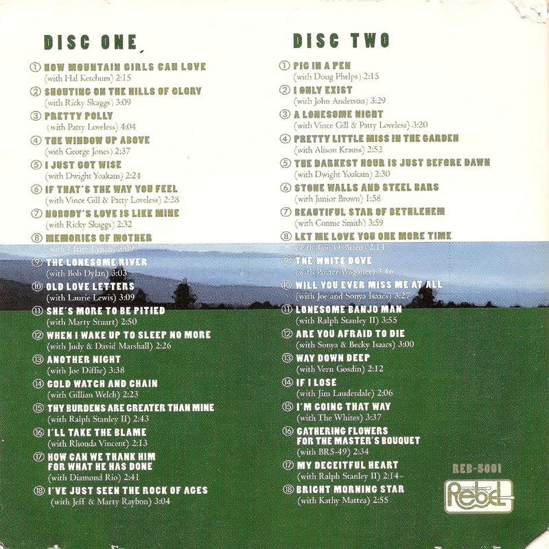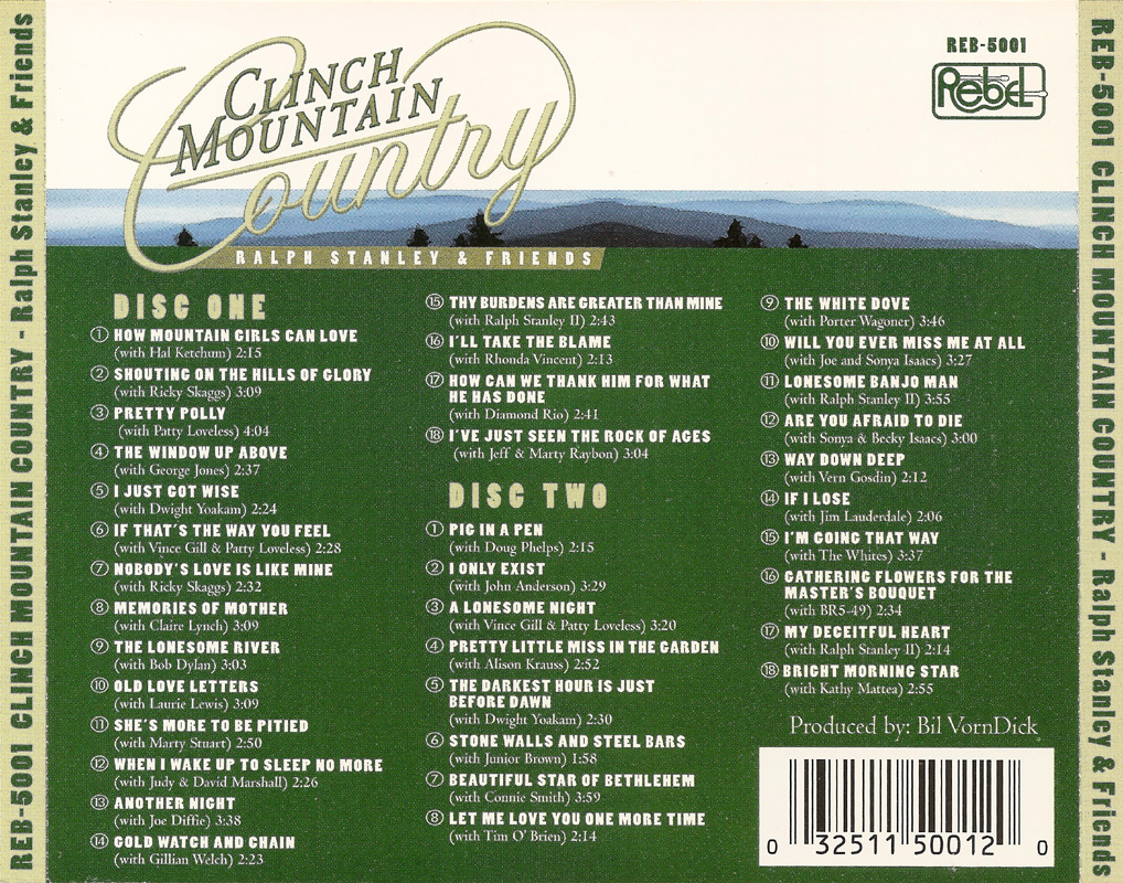It's interesting that the liner notes draw comparison between the album and the Nitty Gritty Dirt Band's 'Will The Crcle Be Unbroken' debut, which 25 years ago had introduced a generation of rock fans to some of yesterdays country/bluegrass stars. 'Clinch Mountain Country', and the other collaborative albums with guest vocalists, seem to have that principal in reverse. i.e. here an older artist (Ralph had turned 70), getting mostly younger country/bluegrass stars to help out. Some of the older generation are present too though, with George Jones and Porter Wagoner going way back, so the idea isn't completely watertight.