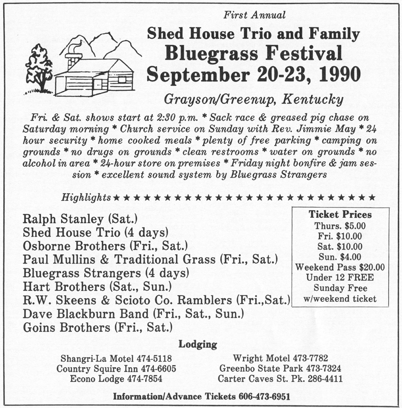 In August 1990, 'Bluegrass Unlimited' included an advert for the '1st Annual Shed House Trio and Family Bluegrass Festival' 20-23 Sept 1990 in Grayson/Greenup, Kentucky. The Shed House Trio were billed on all four nights, with the Goins Brothers also billed for the Friday & Saturday.