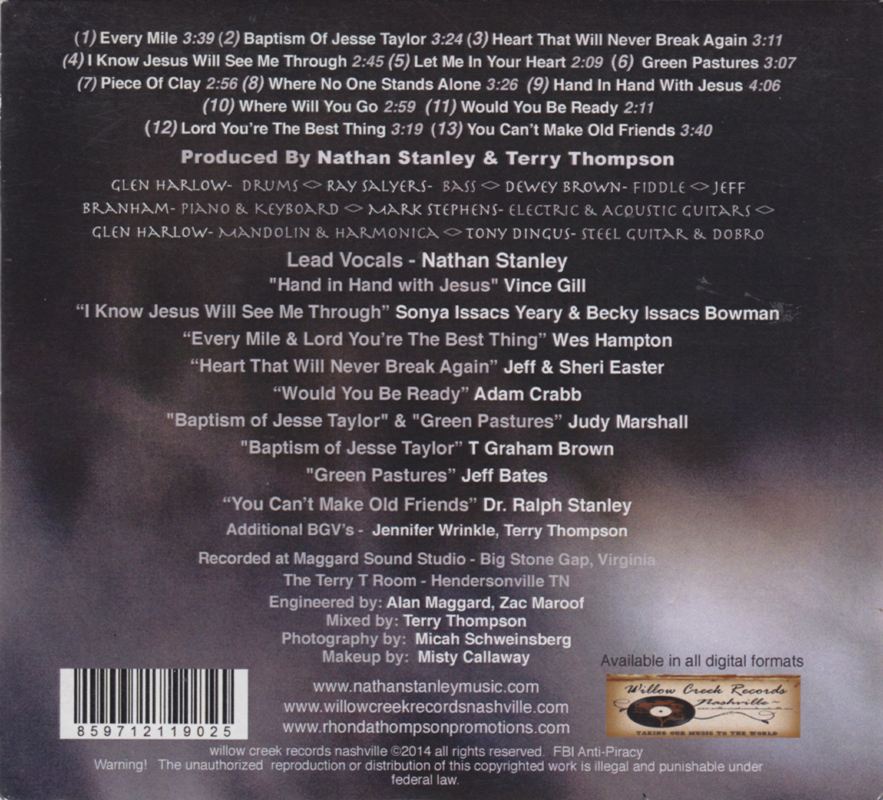 Five of other songs also have links to the Stanley's back catalogue: Baptism Of Jesse Taylor which Ralph recorded on his 1975 LP Let Me Rest On A Peaceful Mountain; Let Me In Your Heart by CMB Dewey Brown, which he recorded on his Hard Times For A Fiddler CD; (Going Up Home To Live In) Green Pastures which Ralph first recorded on his 1968 LP Over The Sunset Hill; Hand In Hand With Jesus which The Stanley Brothers recorded on Good Old Camp Meeting Songs; and Where Will You Go which Nathan recorded with Ralph Stanley on the 2008 Where Will You Go CD.